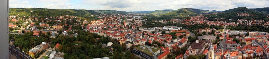 Nach einer kurzen Mittagspause besuchten wir den »JenTower« im Zentrum der Stadt. Schnell erreicht man mit dem Lift die beiden Aussichtsplattformen in 128m Höhe. Bei schönem Wetter bot sich uns ein herrlicher Ausblick über die Stadt Jena mit den umliegenden Kernbergen und Jenzig, der Ruine der Kunitzburg sowie am Horizont der Leuchtenburg.